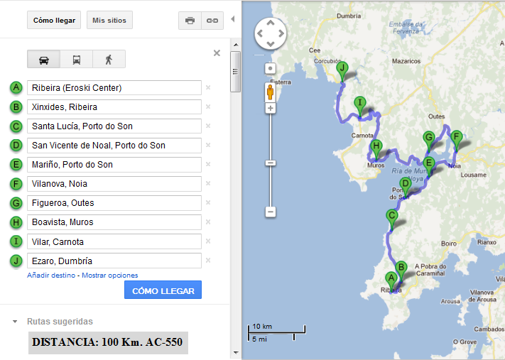 -Ruta sugerida,autopista del Atlantico hasta la salida 104 de Catoira para enlazar con la autovia del Barbanza con final en Riveira.